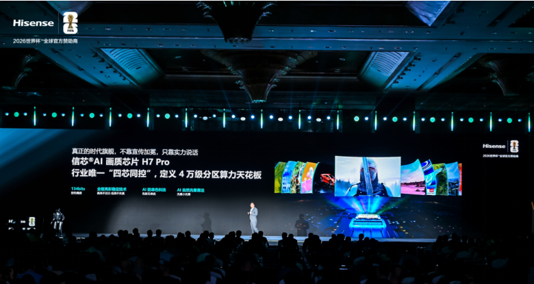 为完美驾驭巅峰光学系统,海信 UX2026 款搭载全行业唯一四芯同控信芯 AI 画质芯片 H7 Pro,以 134bits 行业最高控色精度,搭配AI防串色科技、AI 自然光晕算法,将 Mini LED电视明暗交界处的光晕消融至人眼难以感知的程度。相较QD-Mini LED、SQD-Mini LED 产品,实现 “暗场光晕消融” 与 “亮场色彩饱满” 双重优势,色彩表现力领先行业一代。