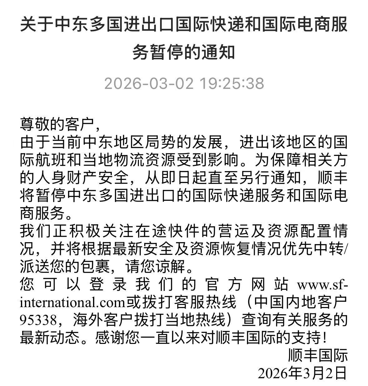 顺丰国际官方公告称,公司进出中东地区的国际航班和当地物流资源受到影响,为保障相关方的人身财产安全,从即日起直至另行通知,顺丰将暂停中东多国进出口的国际快递服务和国际电商服务。