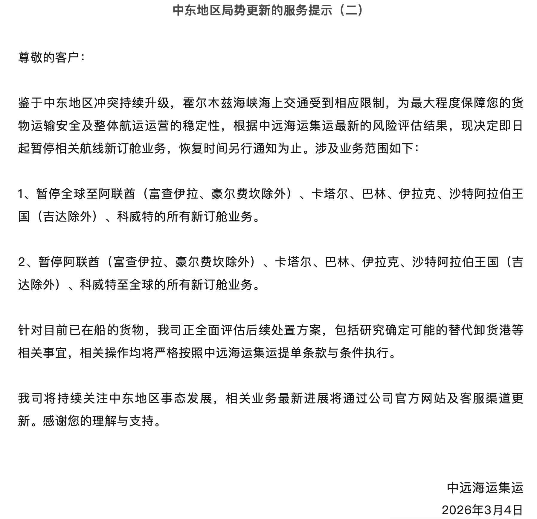 马士基发布的最新客户通知显示,随着局势的不断发展,阿联酋、卡塔尔、巴林、科威特、伊拉克和伊朗等几个国家宣布暂时暂停其空域,作为预防措施,航空公司也取消了或改道了穿越该地区的航班。对此,马士基目前仍然暂停接受进出阿联酋、阿曼(塞拉莱除外的所有港口)、伊拉克、科威特、卡塔尔、巴林、沙特阿拉伯(达曼和朱拜勒除外)的货物预订。