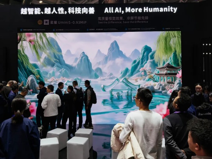在人潮涌动的7号馆A01展位,洲明科技携全球超薄COB广告机、全球首款MIP全息屏等创新产品,以及AI智显、双碳城市、BOSS Think+帷幄舱等商业化解决方案惊艳亮相。