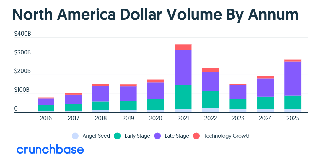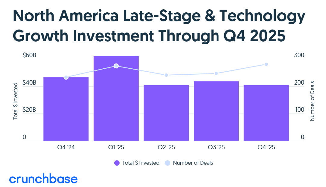 在第四季度和整个2025年,大多数阶段的初创企业投资也表现强劲。后期投资和技术成长型投资交易同样如此,全年吸引了1910亿美元——较2024年增长75%。与此同时,在第四季度,投资者向后期投资和成长型投资交易投入了约410亿美元,较前一季度略有下降。