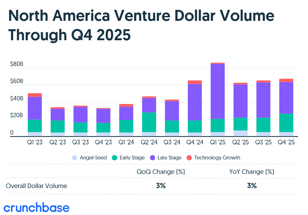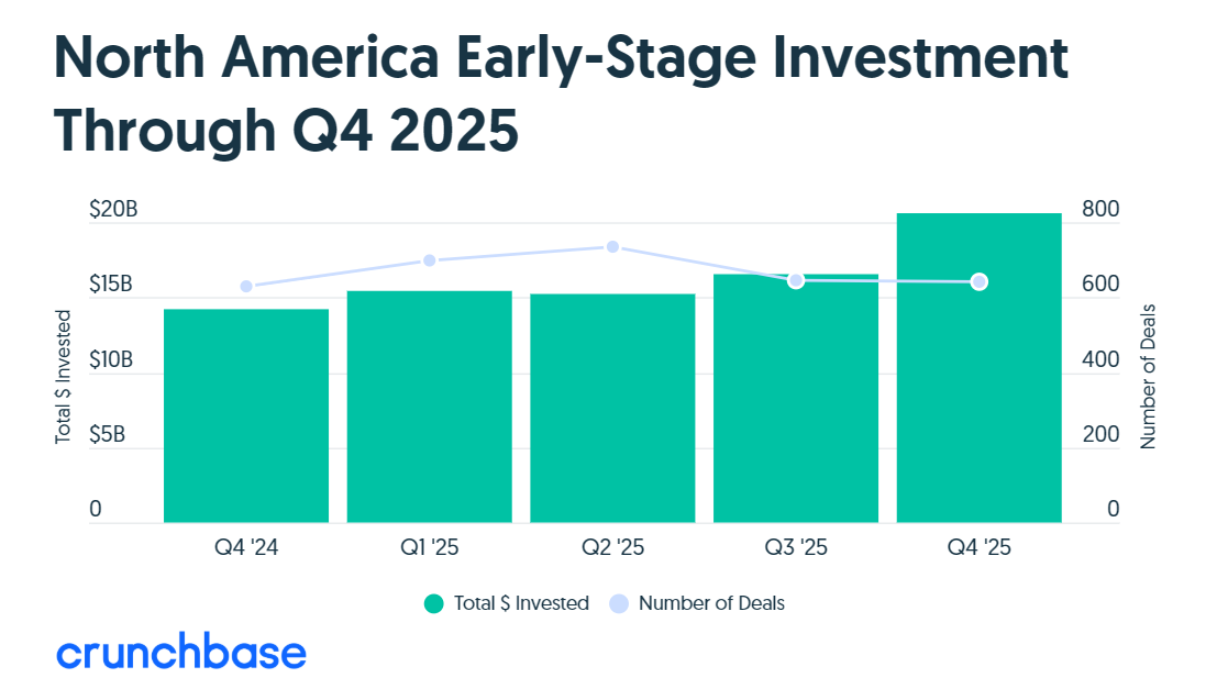 投资者去年在向早期公司开支票方面也相当慷慨。总体而言,2025年有近690亿美元流向了A轮和B轮阶段的公司,同比增长约5%。投资在第四季度达到高点,早期阶段交易获得了216亿美元。