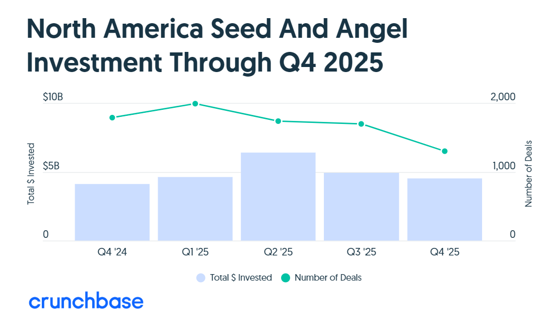 种子轮的投资者在2025年也没有懈怠,向最早期初创企业的报告轮次投入了约204亿美元。然而,这较2024年略有下降,2024年已知投资额高出约9%。去年的交易数量也略有下降,在第四季度达到低点,报告的种子融资仅有1,300多笔。