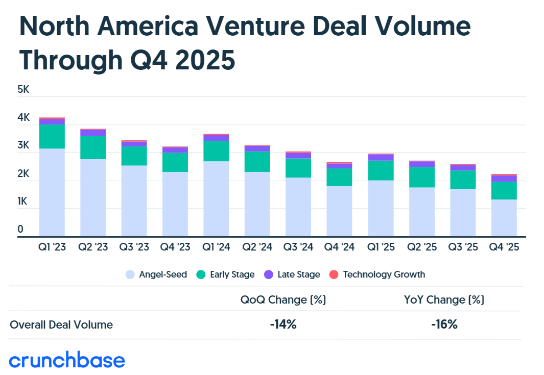 虽然投资额有所上升,但2025年和第四季度的交易数量略有下降,因为更多资本集中在规模更大的融资轮次中。总体而言,交易数量同比下降了约16%,报告的交易轮次略低于10,500笔。第四季度的交易数量也环比下降了约14%。