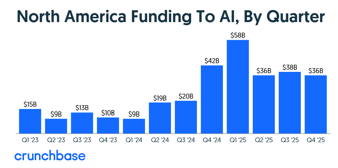 根据Crunchbase的数据,约有1680亿美元——约占北美所有初创企业投资的60%——流向了人工智能相关类别的公司。第四季度投资势头不减,约有360亿美元,即总投资额的一半以上,投向了人工智能。