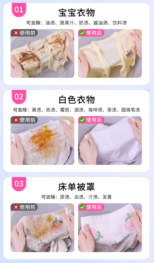 温水激活,释放更多活氧泡泡,与衣物纤维360°无死角接触,实现全覆盖,轻松瓦解顽固污渍。