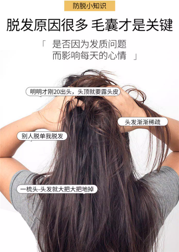 第一步:防脱洗发液。先控制头皮油脂排泌,大量的油脂会堵塞毛囊阻碍毛孔吸收营养。