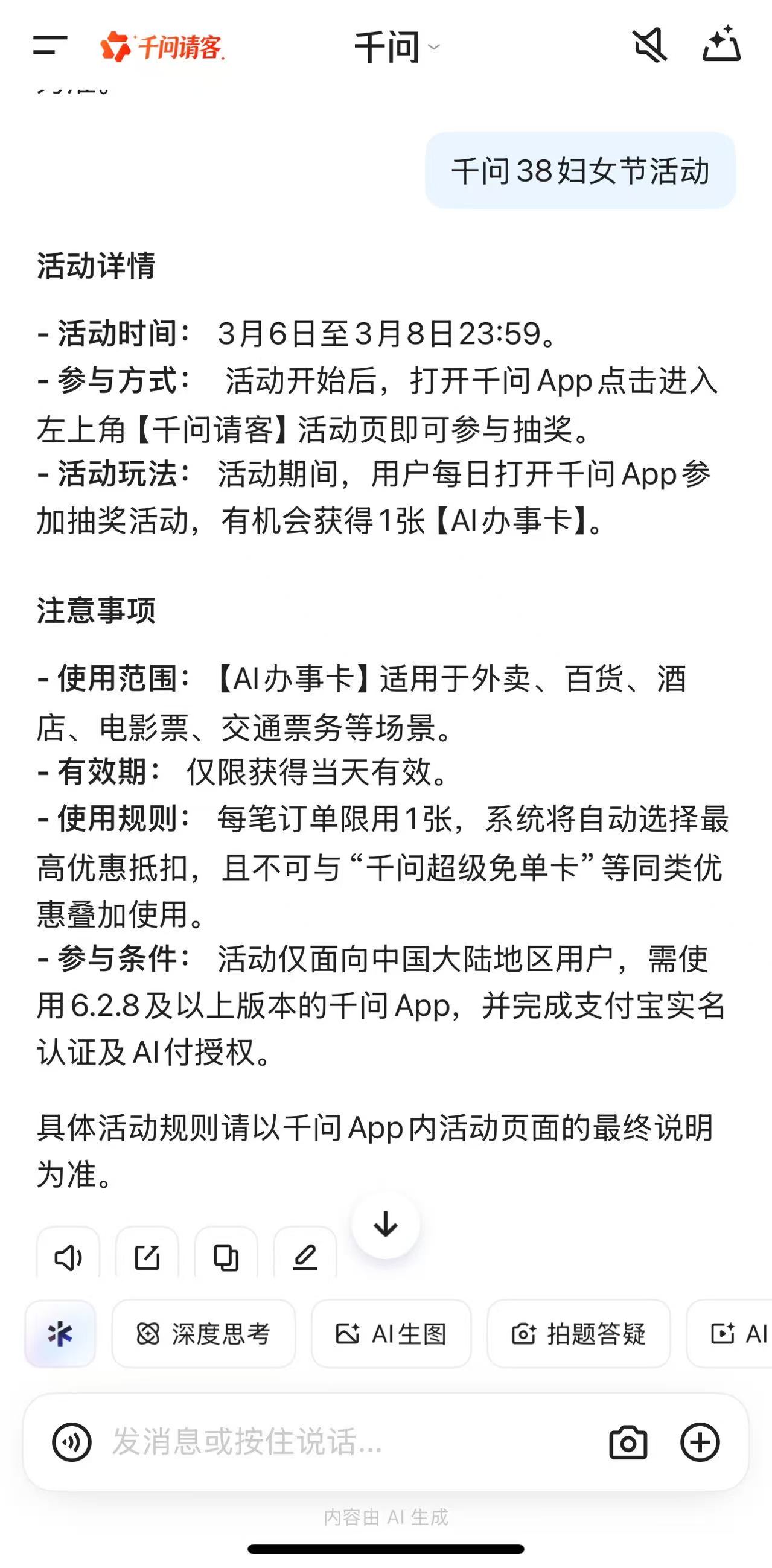 3月6日,界面新闻在千问APP上查询“38妇女节活动”,该APP显示, 活动时间为3月6日至3月8日23:59。