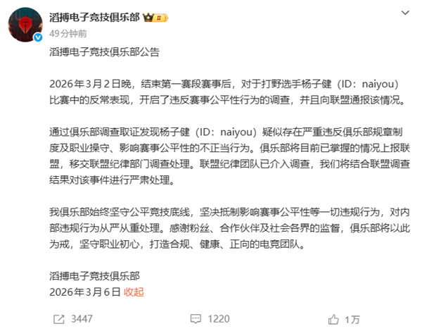 公告称,2026年3月2日晚,结束第一赛段赛事后,对于打野选手杨子健(ID:naiyou)比赛中的反常表现,开启了违反赛事公平性行为的调查,并且向联盟通报该情况。