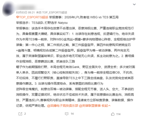 值得一提的是,在3月2日比赛结束后,TES上单选手369还发微博为naiyou和辅助发声。