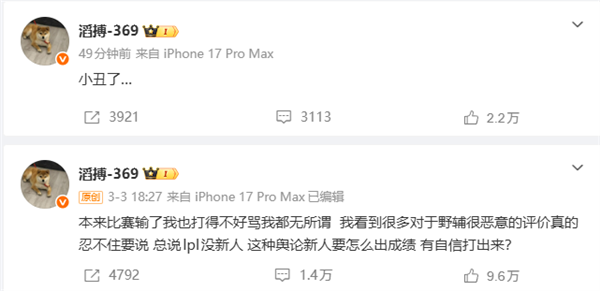 369表示:“本来比赛输了,我也打得不好,骂我都无所谓,我看到很多对于野辅很恶意的评价,真的忍不住要说,总说lpl没新人,这种舆论新人要怎么出成绩,有自信打出来? ”