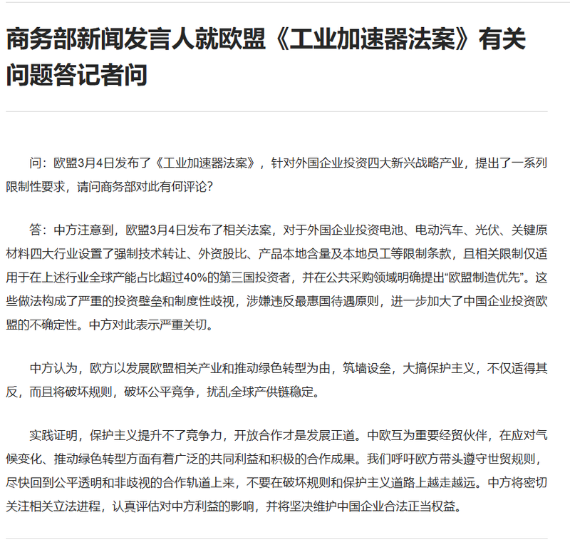 答:中方注意到,欧盟3月4日发布了相关法案,对于外国企业投资电池、电动汽车、光伏、关键原材料四大行业设置了强制技术转让、外资股比、产品本地含量及本地员工等限制条款,且相关限制仅适用于在上述行业全球产能占比超过40%的第三国投资者,并在公共采购领域明确提出“欧盟制造优先”。这些做法构成了严重的投资壁垒和制度性歧视,涉嫌违反最惠国待遇原则,进一步加大了中国企业投资欧盟的不确定性。中方对此表示严重关切。
