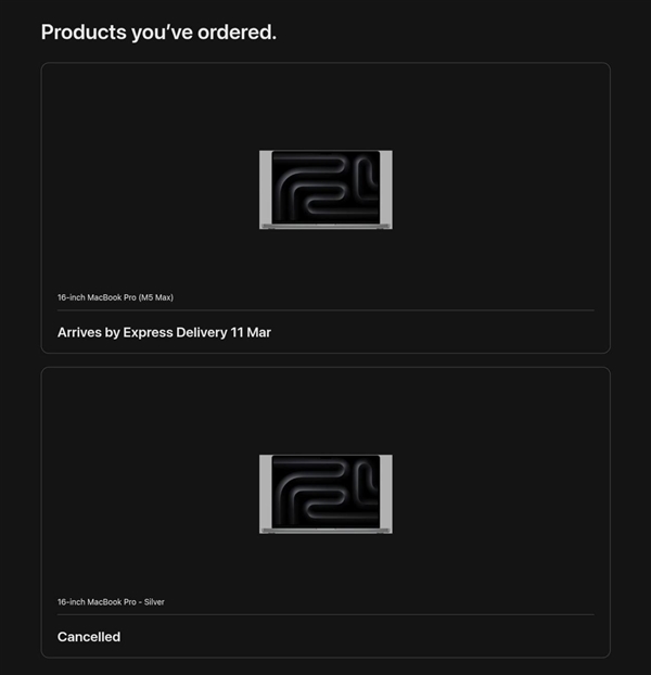 o2b也分享了自己的经历,他在二月中旬下单了48GB内存的M4 Max MacBook Pro,原本预计3月3日-10日送达,没想到订单突然被取消并换成了M5 Max版本,价格维持原价,发货日期也顺延至新机开售的3月11日。