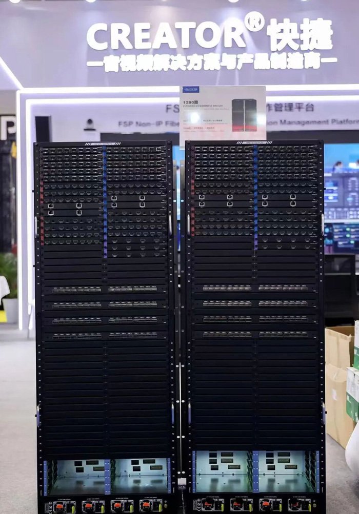 此外我们还展出了1280路FSP光纤矩阵。FSP光纤矩阵所有硬件软件 100% 全国产,支持操作系统的 B/S 架构开放式控制,自主可控,兼容性强。支持任意型号多台矩阵的级联,最大可扩展1280路超大规模信号处理输入输出。具有双备份功能,双控制卡、双电源、双光热备,安全备份可靠有保障。
