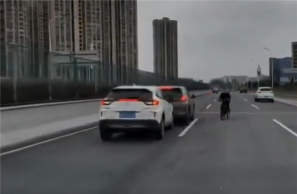 从画面看,当时视频车行驶在高架桥上,一大爷骑着自行车从匝道上来后,直接掉头开始在主道上逆行。