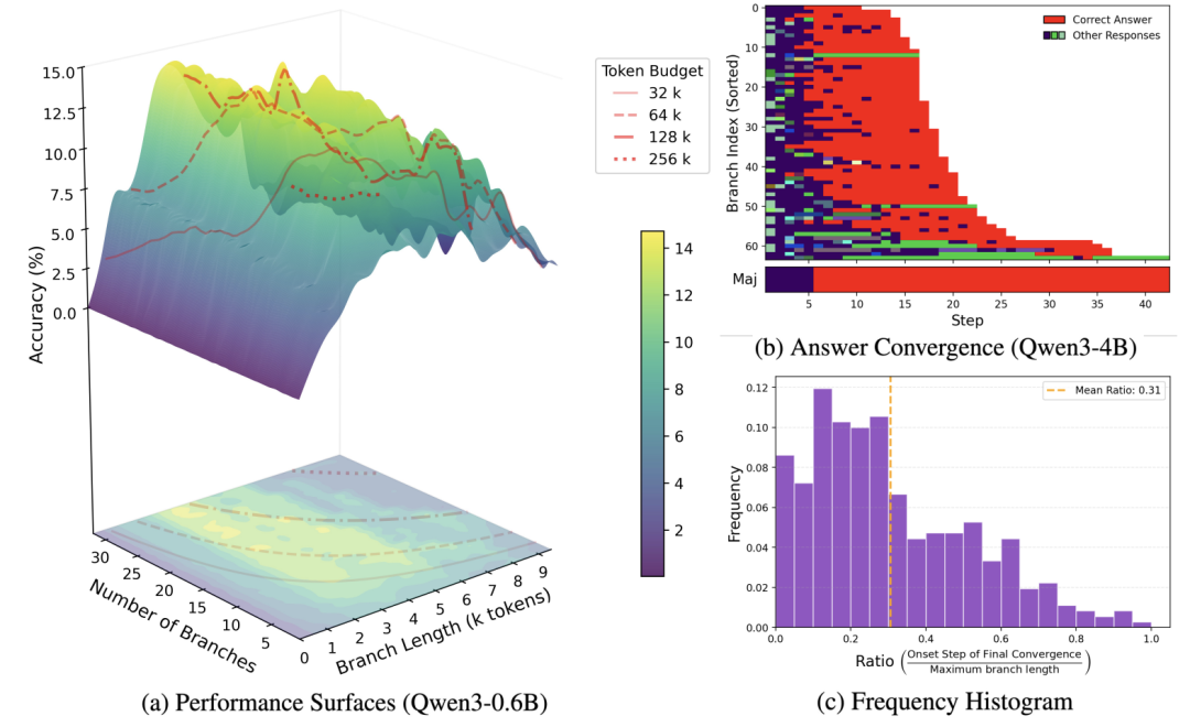 为了回答这一问题,来自马里兰大学、圣路易斯华盛顿大学、北卡罗来纳大学教堂山分校等机构的研究团队提出了 Parallel-Probe。不同于直接从算法设计出发,该研究首先通过引入 2D Probing,对 online 并行推理过程中的全局动态性进行了系统性刻画。研究发现,并行推理并非一个「算得越多越好」的过程:全局共识往往在所有分支结束之前就已提前稳定,而少数冗长的长尾路径却持续占据大量计算资源,成为并行推理效率的主要瓶颈。