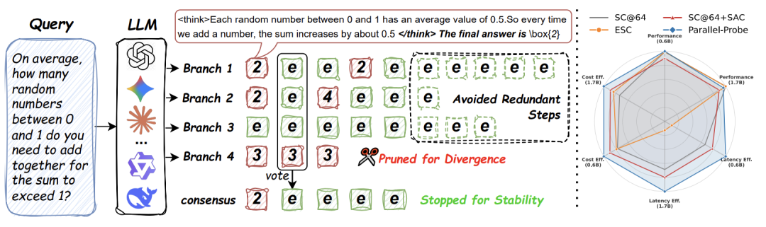 基于共识的早期停止(Consensus-based Early Stopping):该机制周期性地从各分支中提取中间结果。一旦探测到全局多数答案在连续几个周期内保持稳定,控制器将直接终止整组推理,避免后续冗余步骤。