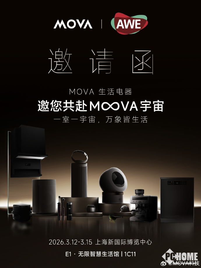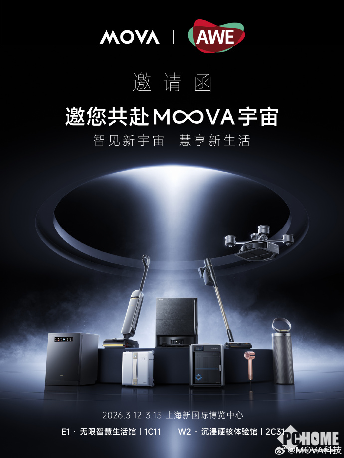 PChome 3月7号消息,MOVA官宣将携31款MOVA首发新品亮相AWE2026,此次AWE MOVA将设立两个展区,包括E1馆 1C11无限智慧生活馆以及W2馆2C31沉浸硬核体验馆。