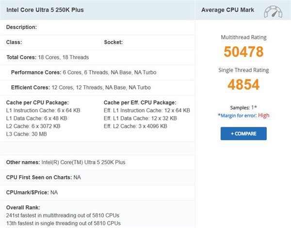 快科技3月8日消息,Intel即将推出代号为Arrow Lake Refresh的新一代处理器,其中定位中端的酷睿Ultra 5 250K Plus近日首次出现在PassMark中。