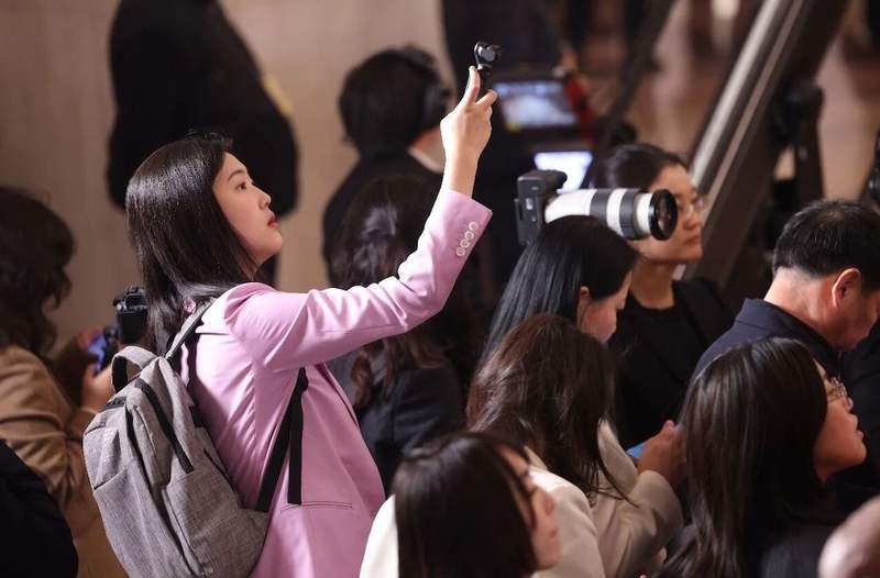 3月5日,人民大会堂,一名女记者拍摄第十四届全国人民代表大会第四次会议首场“代表通道”集中采访活动。
