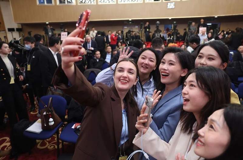 3月8日,梅地亚中心,参加十四届全国人大四次会议外交主题记者会的中外女记者一起拍照并高呼“节日快乐”。