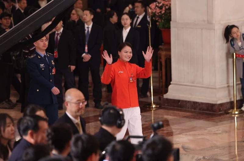 3月7日,天安门广场,参加全国政协十四届四次会议第二次全体会议的女政协委员向记者挥手致意。