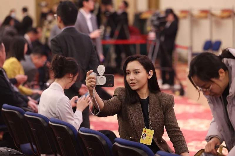 3月6日,十四届全国人大四次会议在北京梅地亚中心新闻发布厅举行记者会。记者会前,一名女记者录制vlog。