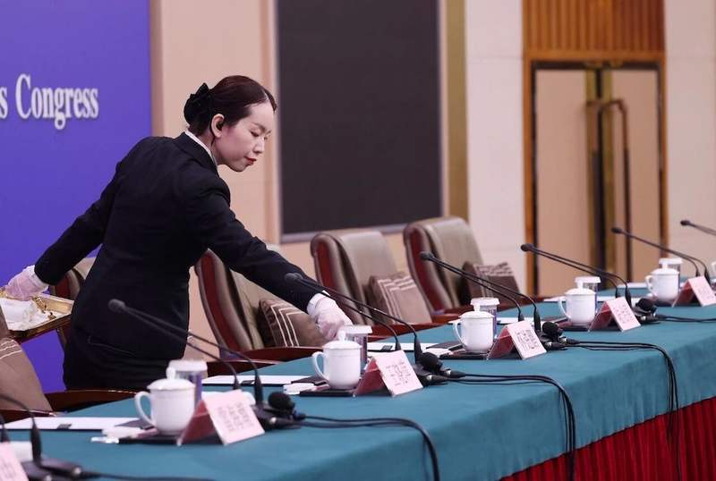 3月7日,十四届全国人大四次会议民生主题记者会在梅地亚中心新闻发布厅举行。记者会前,一名两会服务保障工作人员精心布置会场。