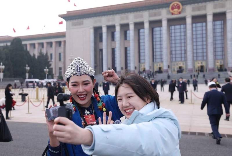 3月7日,两名少数民族女政协委员在人民大会堂前合影。服务保障
