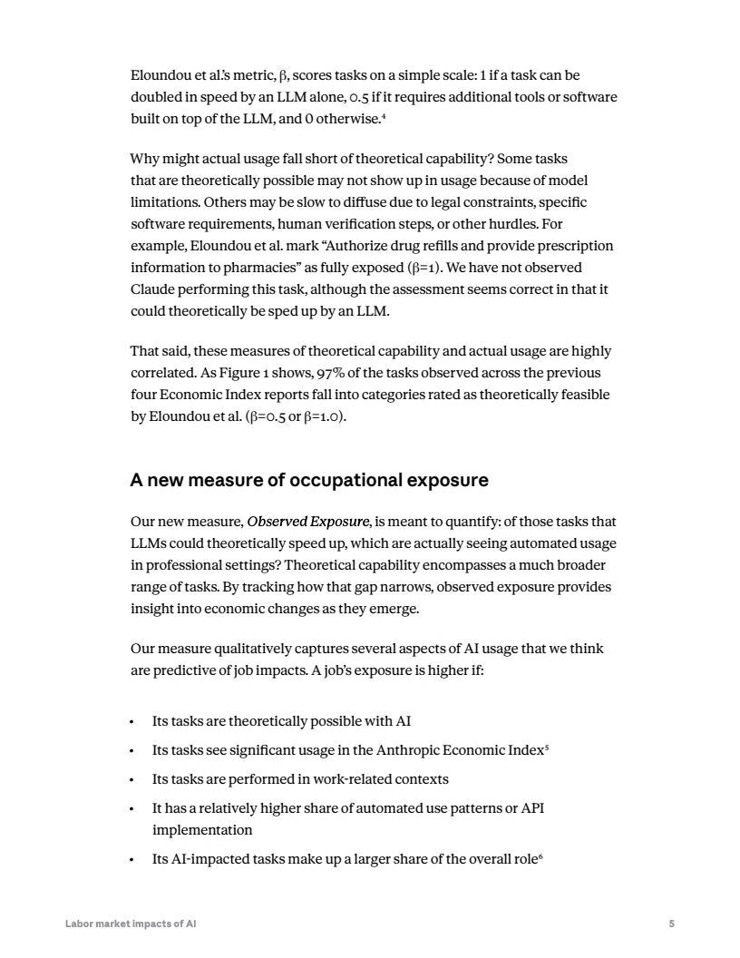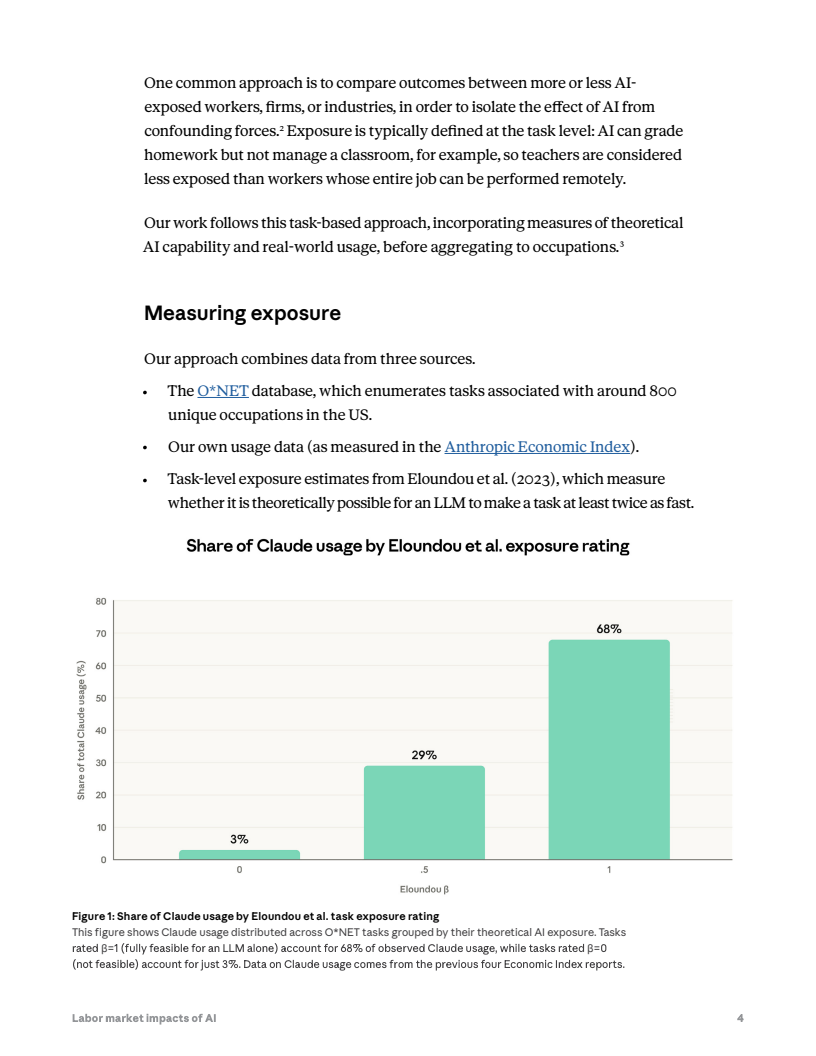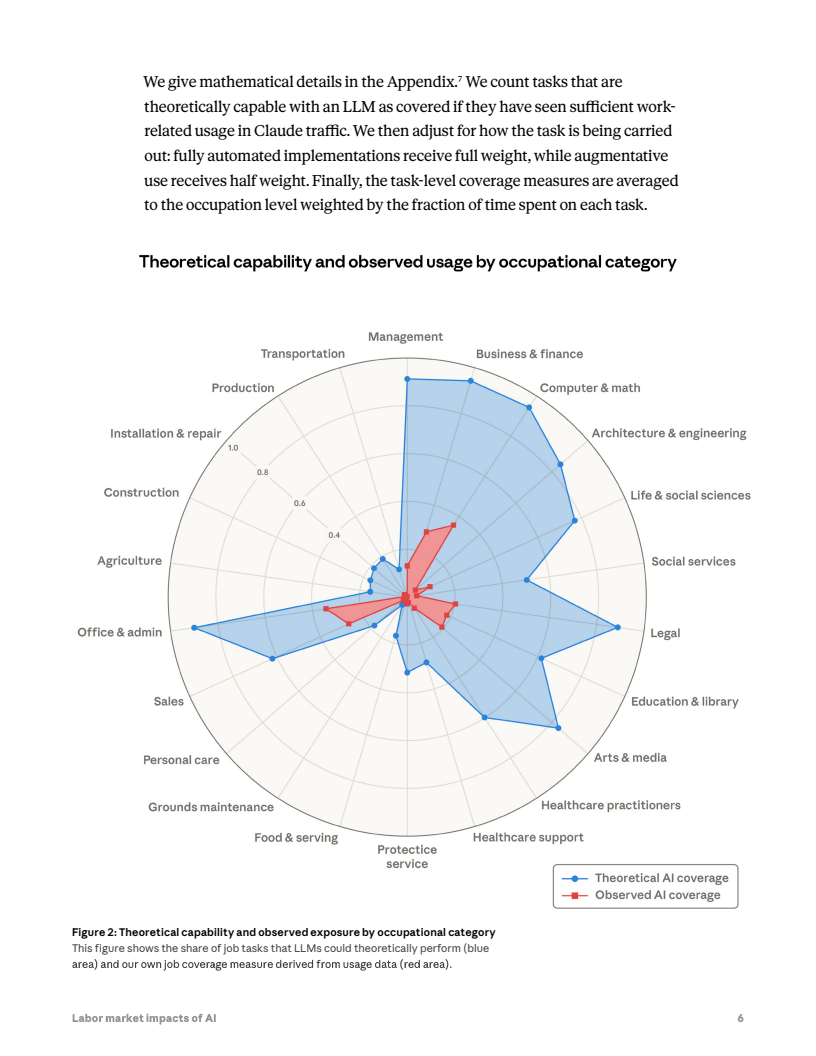 报告提出一种新的“实际暴露度”指标,用于衡量人工智能对就业的真实影响。该指标将大型语言模型的理论能力、真实使用数据以及任务自动化程度结合,并对自动化程度较高且与工作直接相关的应用赋予更高权重。研究整合约800种职业任务数据库、AI平台使用数据以及任务层级可自动化评估,以此计算AI在各职业中的实际覆盖率。