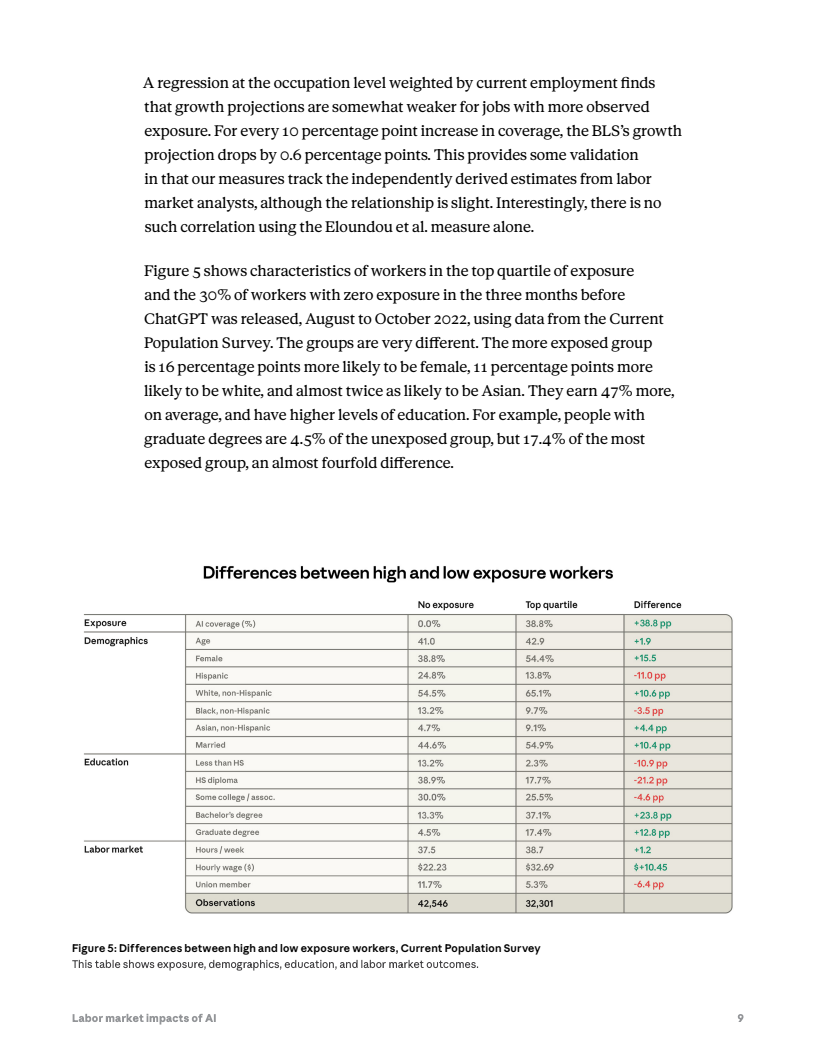 人口结构层面,高暴露职业的劳动者特征也明显不同。处于最高暴露四分位的群体平均收入比低暴露群体高47%,女性比例高出约16个百分点,研究生学历占比达17.4%,而低暴露群体仅4.5%。这意味着AI当前主要影响的是高教育、高收入的知识型岗位,而非传统低技能劳动。