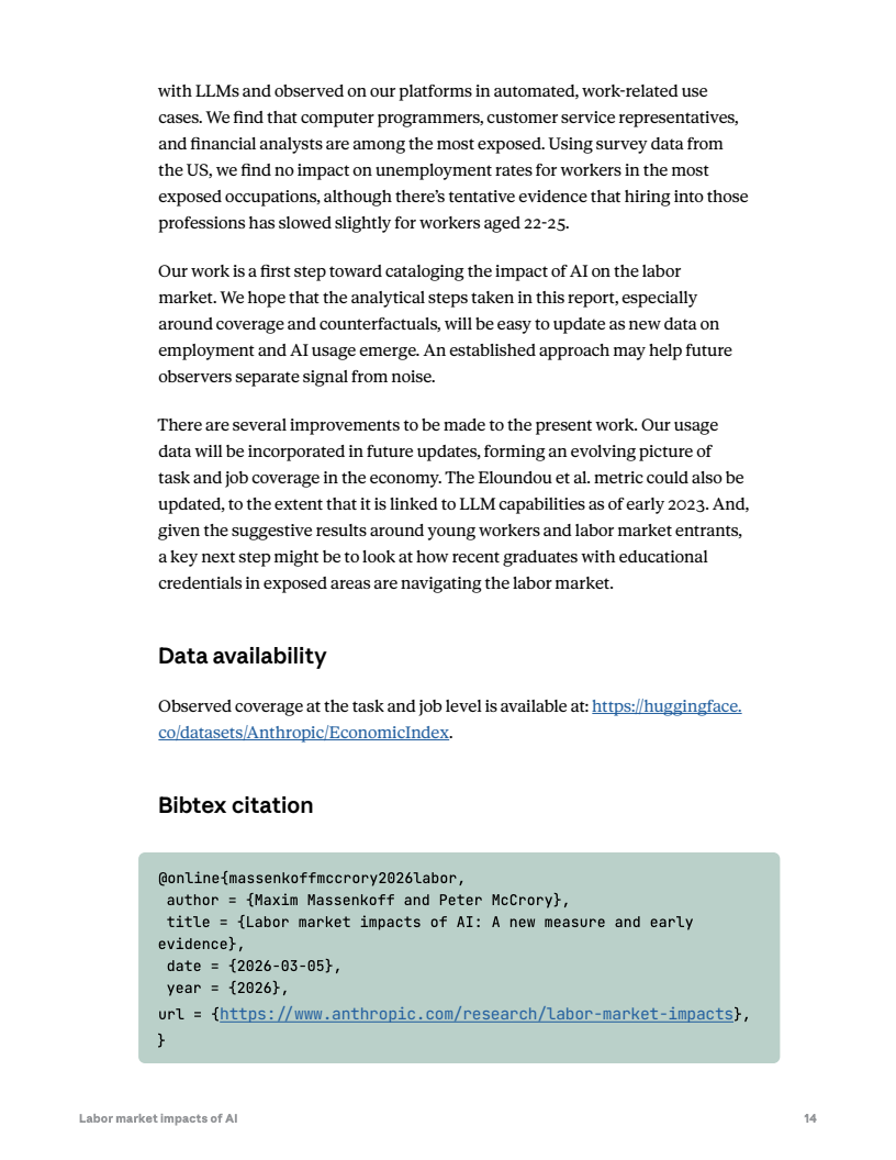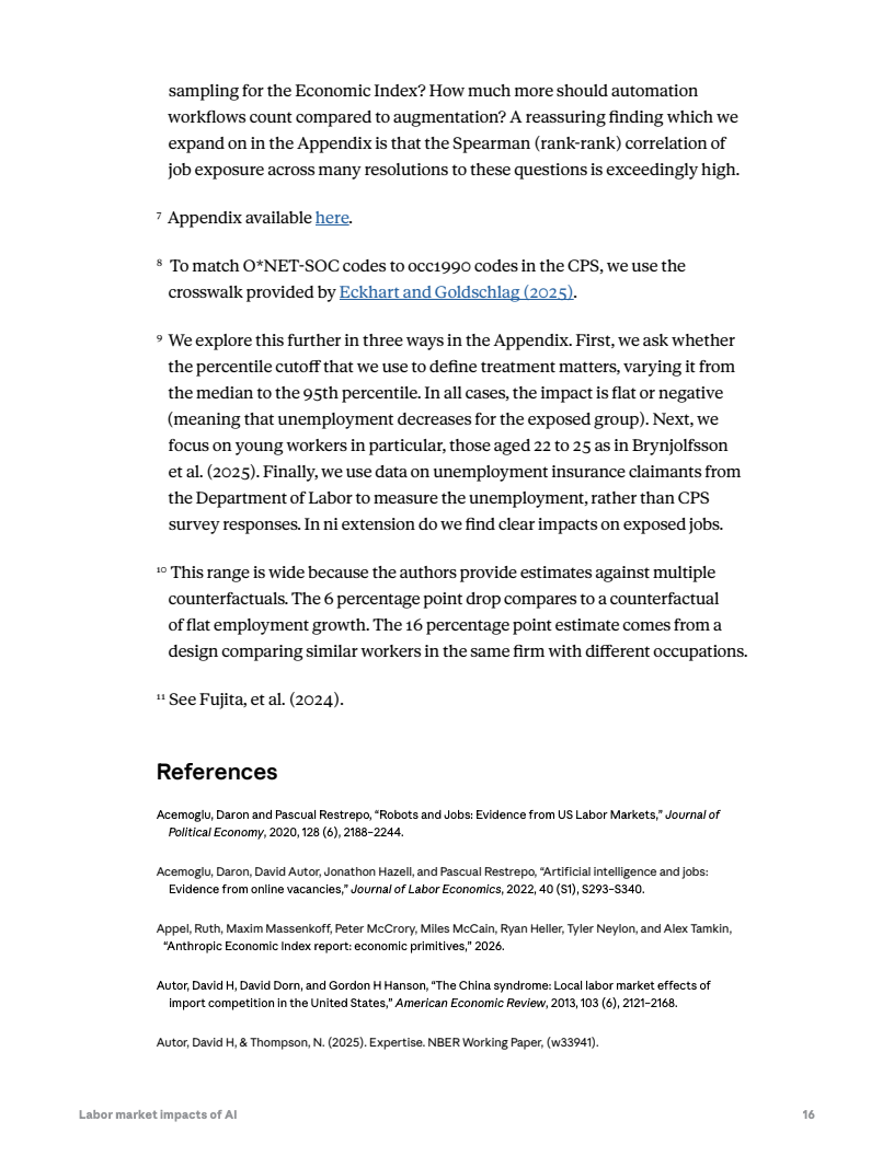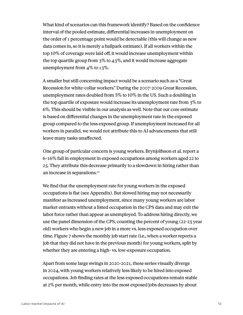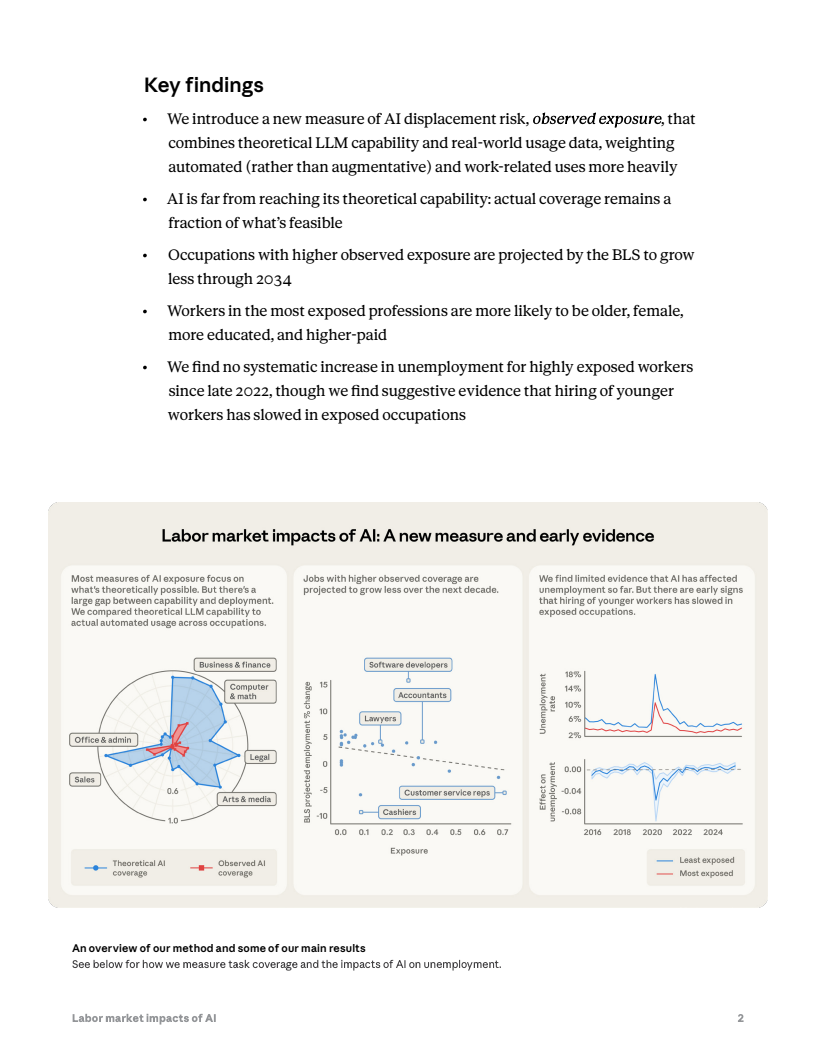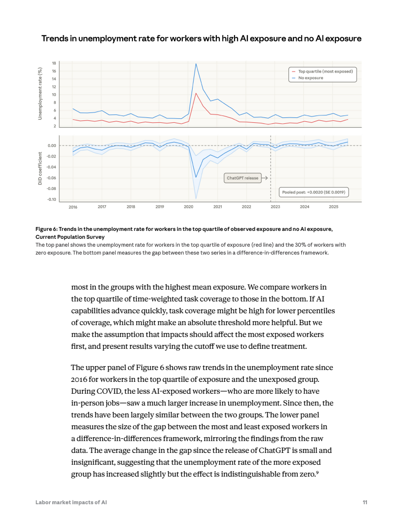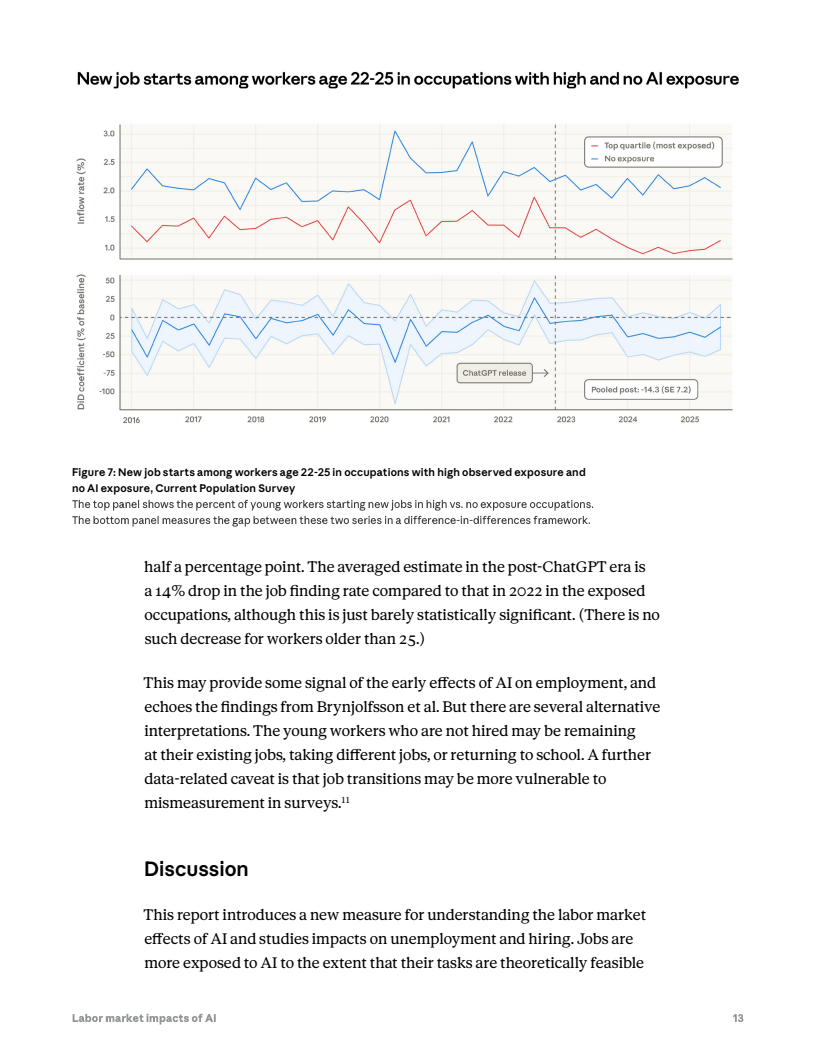 然而,就业市场尚未出现明显失业冲击。自2022年ChatGPT发布以来,高暴露职业群体的失业率变化与低暴露群体基本同步,没有显著上升。但数据显示,22至25岁年轻人在高暴露职业中的新岗位进入率下降约14%,表明企业招聘需求可能开始出现边际收缩。