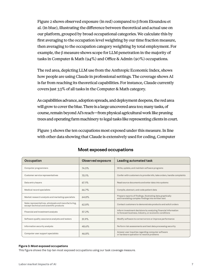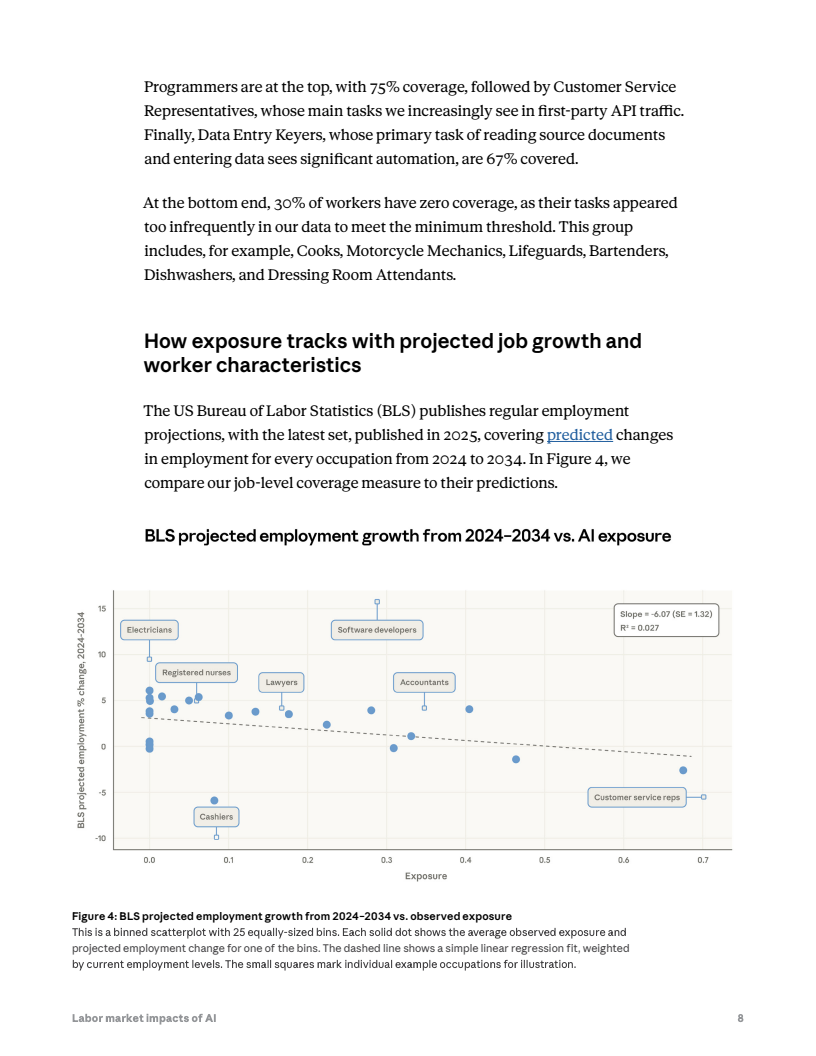 职业层面的暴露度呈现明显分化。程序员是AI暴露度最高的职业之一,任务覆盖率约75%。客服人员约70%,数据录入人员约67%。此外,医疗记录管理员、市场研究分析师、销售代表以及金融投资分析师等岗位也处于高暴露区间。相比之下,厨师、机械维修工、救生员、酒保等以体力或现场服务为主的岗位几乎未被AI覆盖。