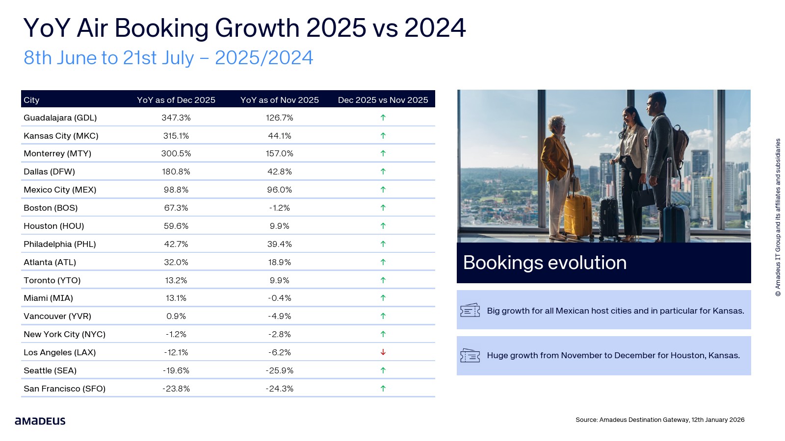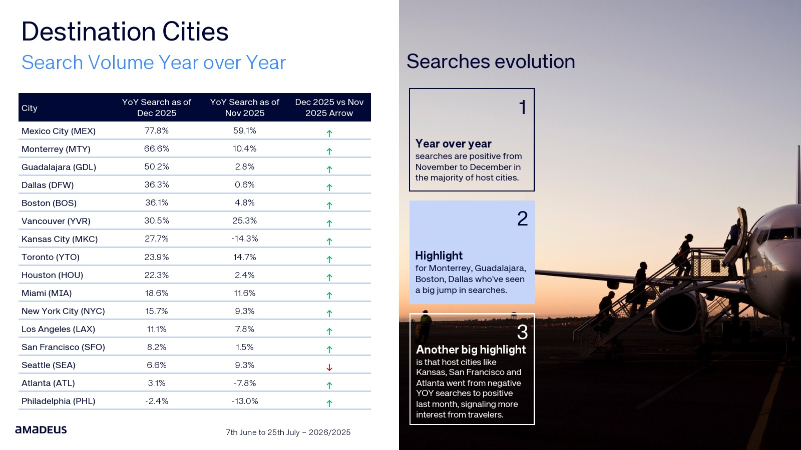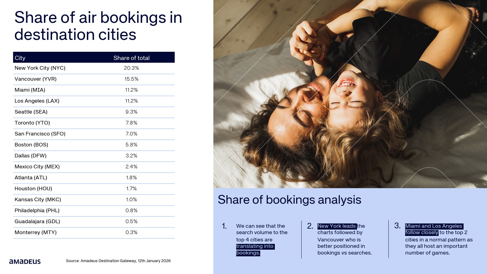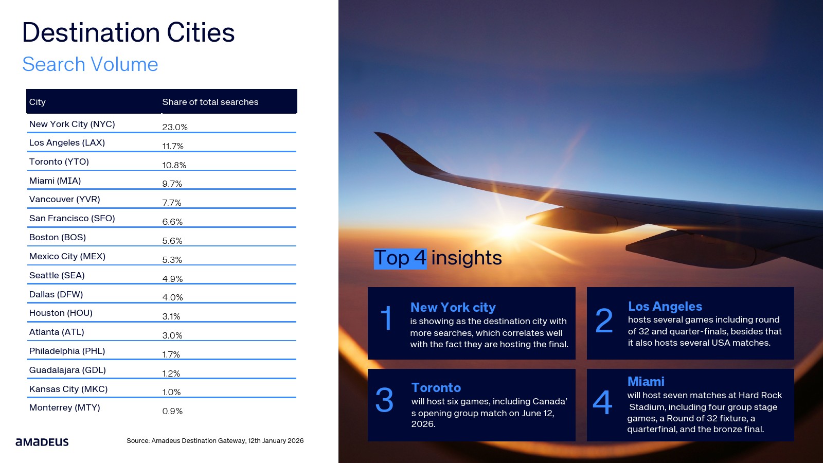 航班预订数据进一步验证了需求转化。纽约占整体航班预订的20.3%,温哥华达到15.5%,迈阿密与洛杉矶均为11.2%。与此同时,墨西哥城市的航班预订同比增幅极为显著,瓜达拉哈拉达到347%,堪萨斯城315%,蒙特雷300%。搜索兴趣正快速转化为真实出行需求。