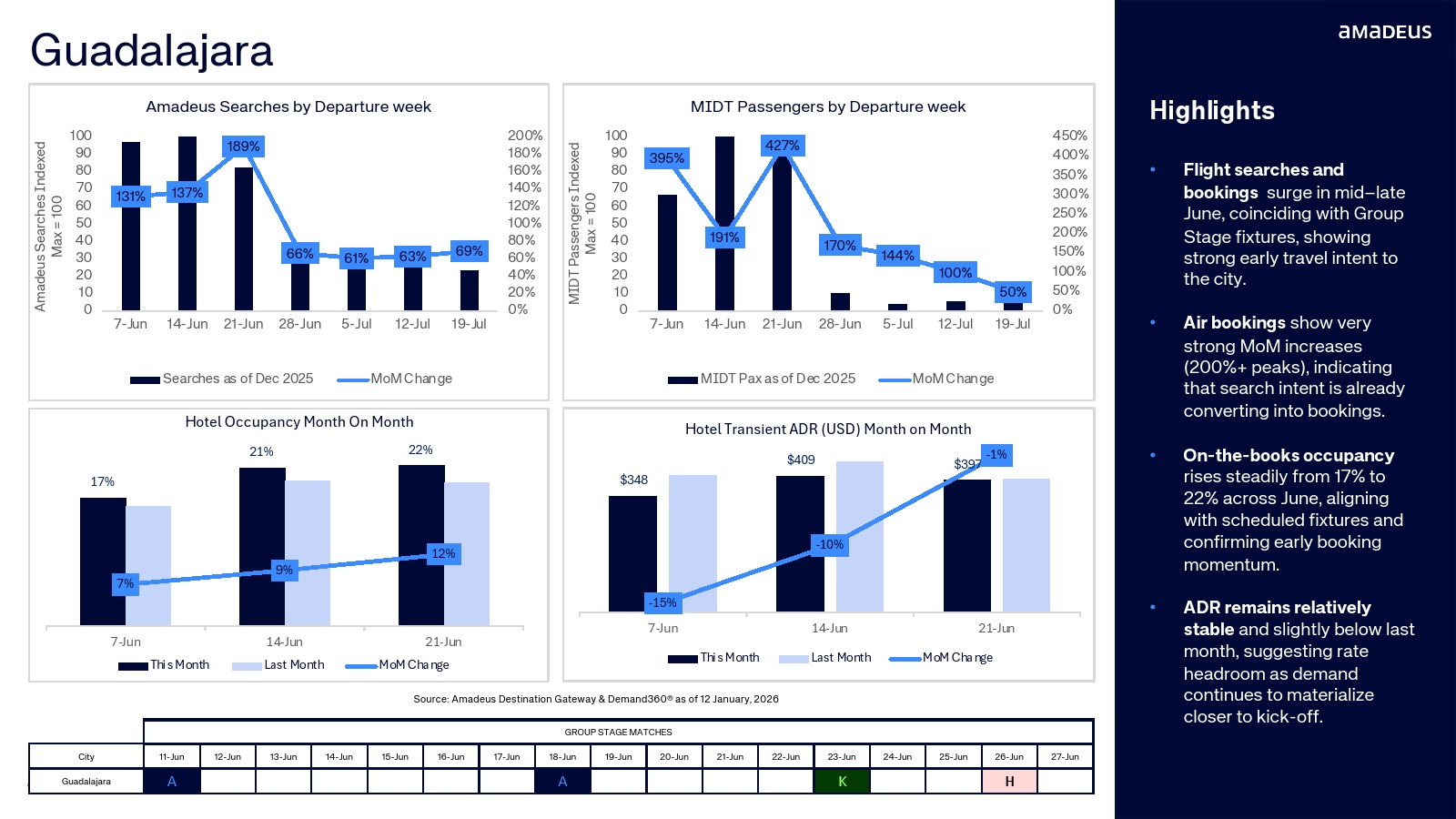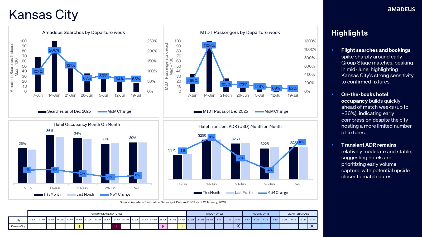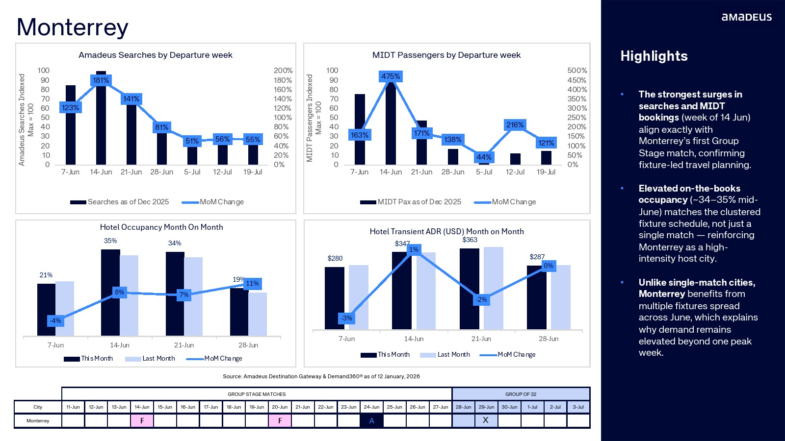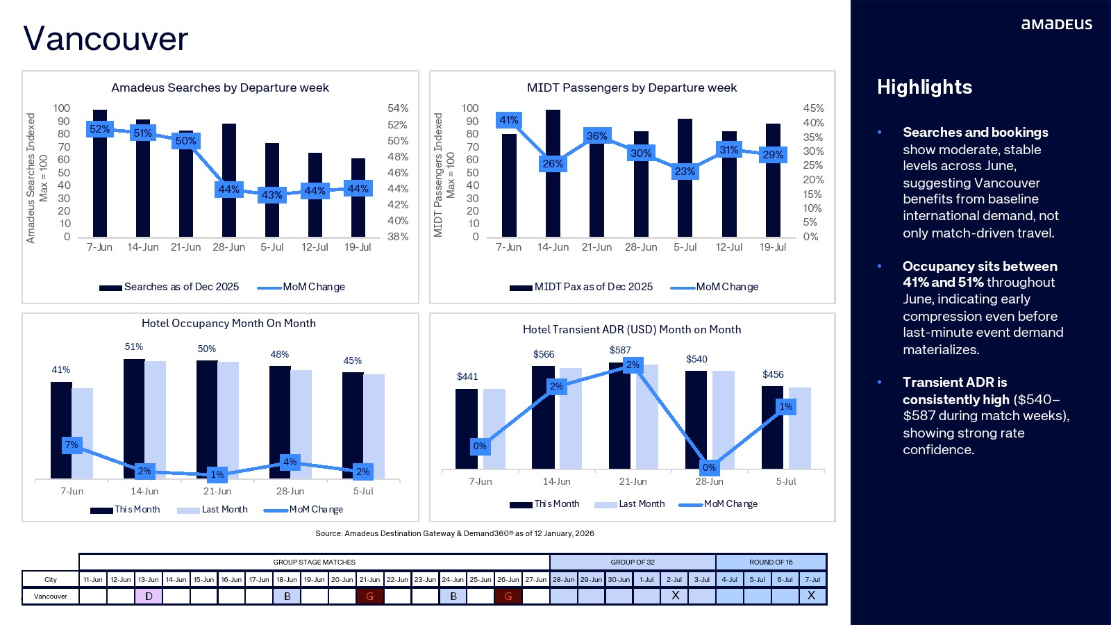航班预订数据进一步验证了需求转化。纽约占整体航班预订的20.3%,温哥华达到15.5%,迈阿密与洛杉矶均为11.2%。与此同时,墨西哥城市的航班预订同比增幅极为显著,瓜达拉哈拉达到347%,堪萨斯城315%,蒙特雷300%。搜索兴趣正快速转化为真实出行需求。