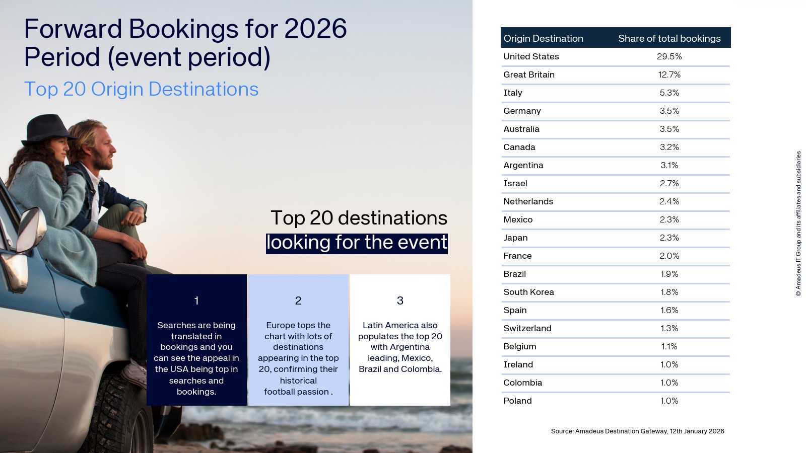 从客源结构看,北美与欧洲构成赛事旅行需求的主体。美国贡献21.6%的航班搜索量位居第一,英国以11.6%排名第二,加拿大4.8%位列第三。德国4.2%、意大利4.1%、巴西3.9%、法国3.4%以及日本3.3%等传统足球强国也进入前十。这一结构说明赛事不仅激活主办国区域旅行,也体现欧洲及南美长期稳定的足球消费文化。