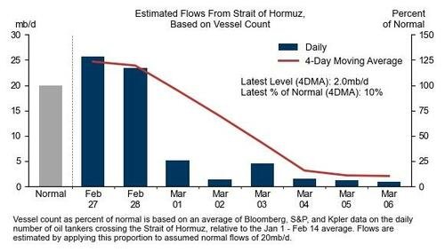 第一,高盛预计通过霍尔木兹海峡的石油流量已减少了1800万桶/日——目前的流量大约相当于正常水平的10%,低于其早些时候假设的15%。因此,高盛围绕基准情景的假设风险,已进一步偏向航运流量将在更长时间内处于更低水平。
