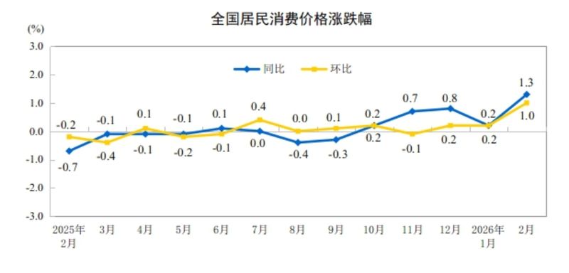 新京报讯 据国家统计局消息,2026年2月份,全国居民消费价格同比上涨1.3%。其中,城市上涨1.4%,农村上涨0.9%;食品价格上涨1.7%,非食品价格上涨1.3%;消费品价格上涨1.1%,服务价格上涨1.6%。1—2月平均,全国居民消费价格比上年同期上涨0.8%。