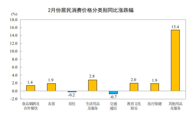 2月份,食品烟酒及在外餐饮类价格同比上涨1.4%,影响CPI(居民消费价格指数)上涨约0.41个百分点。食品中,鲜菜价格上涨10.9%,影响CPI上涨约0.19个百分点;水产品价格上涨6.1%,影响CPI上涨约0.11个百分点;鲜果价格上涨5.9%,影响CPI上涨约0.12个百分点;蛋类价格下降2.9%,影响CPI下降约0.02个百分点;畜肉类价格下降2.7%,影响CPI下降约0.11个百分点,其中猪肉价格下降8.6%,影响CPI下降约0.17个百分点。