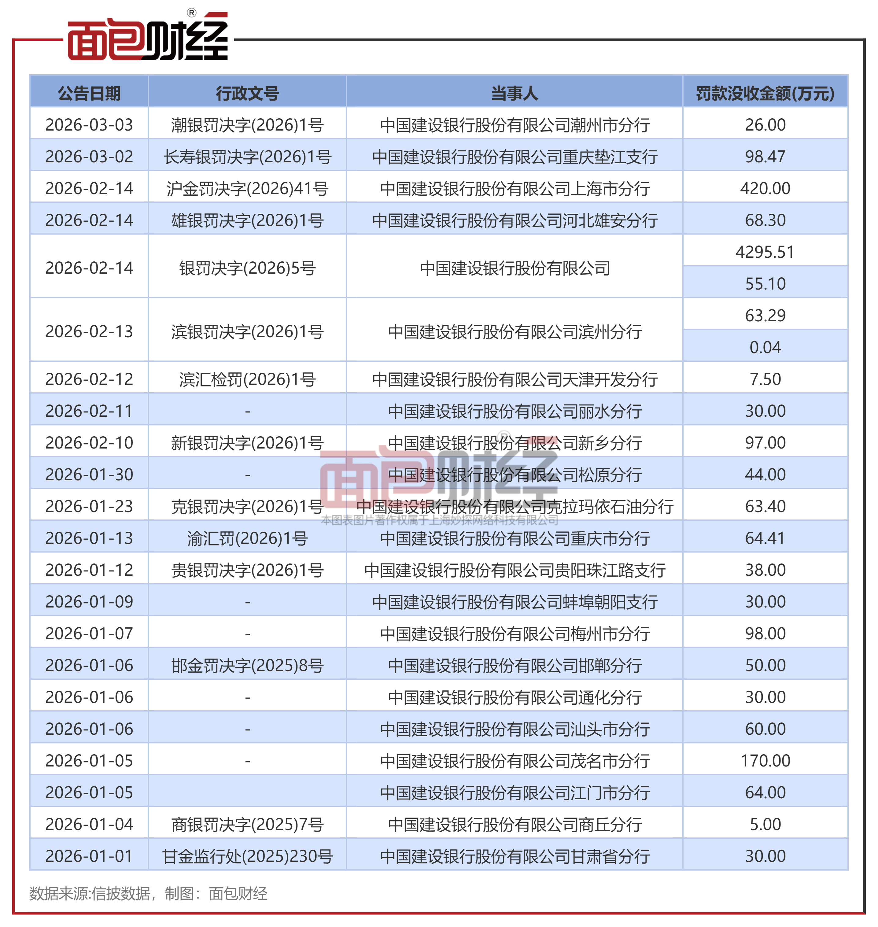 公开资料显示,建设银行在2026年收到罚单数量超过20张,合计罚没金额超过5900万元。