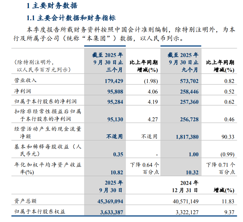 2025年前三季度,建设银行实现营业总收入5737.02亿元,同比增长0.82%;归母净利润2573.60亿元,同比增长0.62%。截至2025年9月末,公司资产总额达45.37万亿元,较上年末增长11.83%。