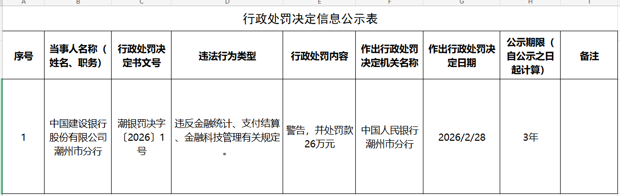 公告显示,中国建设银行股份有限公司潮州市分行违反金融统计、支付结算、金融科技管理有关规定,被警告并罚款26万元。