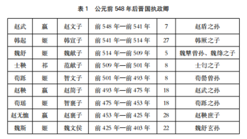 到了公元前6世纪中叶,晋国经过几次大的血洗,基本形成了六家主晋的局面。从公元前 548年到公元前490年赵鞅灭中行氏、范氏,不仅六卿成员完全是六大宗族,而且中不将、执政卿也完全在这六个家族中产生。公元前548年到公元前541年(七年),中军将是赵氏的赵武功;公元前541年到公元前514年,是韩氏的韩起执政(二十七年);公元前514年到公元前509年是魏氏的魏舒任中军将(五年):公元前509年到公元前501年是范氏的士鞅执政(八年);公元前501年到公元前493年是智氏的荀跞任中军将(八年);然后,从公元前493年,又是赵氏的赵鞅执政。如此,六家主晋的局面已经形成。