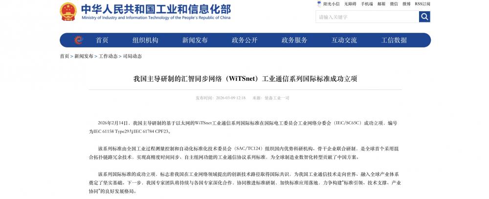 C114讯 3月9日消息(苡臻)据工信部消息,2月14日,我国主导研制的基于以太网的WiTSnet工业通信系列国际标准在国际电工委员会工业网络分委会(IEC/SC65C)成功立项,编号为IEC 61158 Type29与IEC 61784 CPF23。