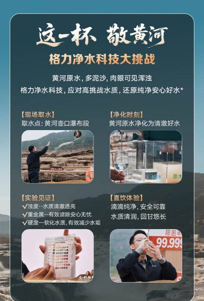 去年9月,黄河壶口瀑布前,一场“这一杯,敬黄河”的硬核直播震撼了无数人。浑浊的“黄河原浆”经格力6个9净水机现场过滤,瞬间化为清泉,被当场一饮而尽。这杯水,敬的是奔流不息的母亲河,敬的是永不妥协的中国科技,更是敬每一个值得被用心守护的家庭。保护母亲河日让这份敬意有了更深远的回响——守护江河生态,就是守护我们的饮水生命线。从黄河到长江,从珠江到湘江,格力将“家乡水放心喝”的承诺带到了全国30余座城市。如今,这份守护可以抵达您的家中,让您和家人在畅饮健康好水的同时,读懂江河生态与居家健康的紧密关联。