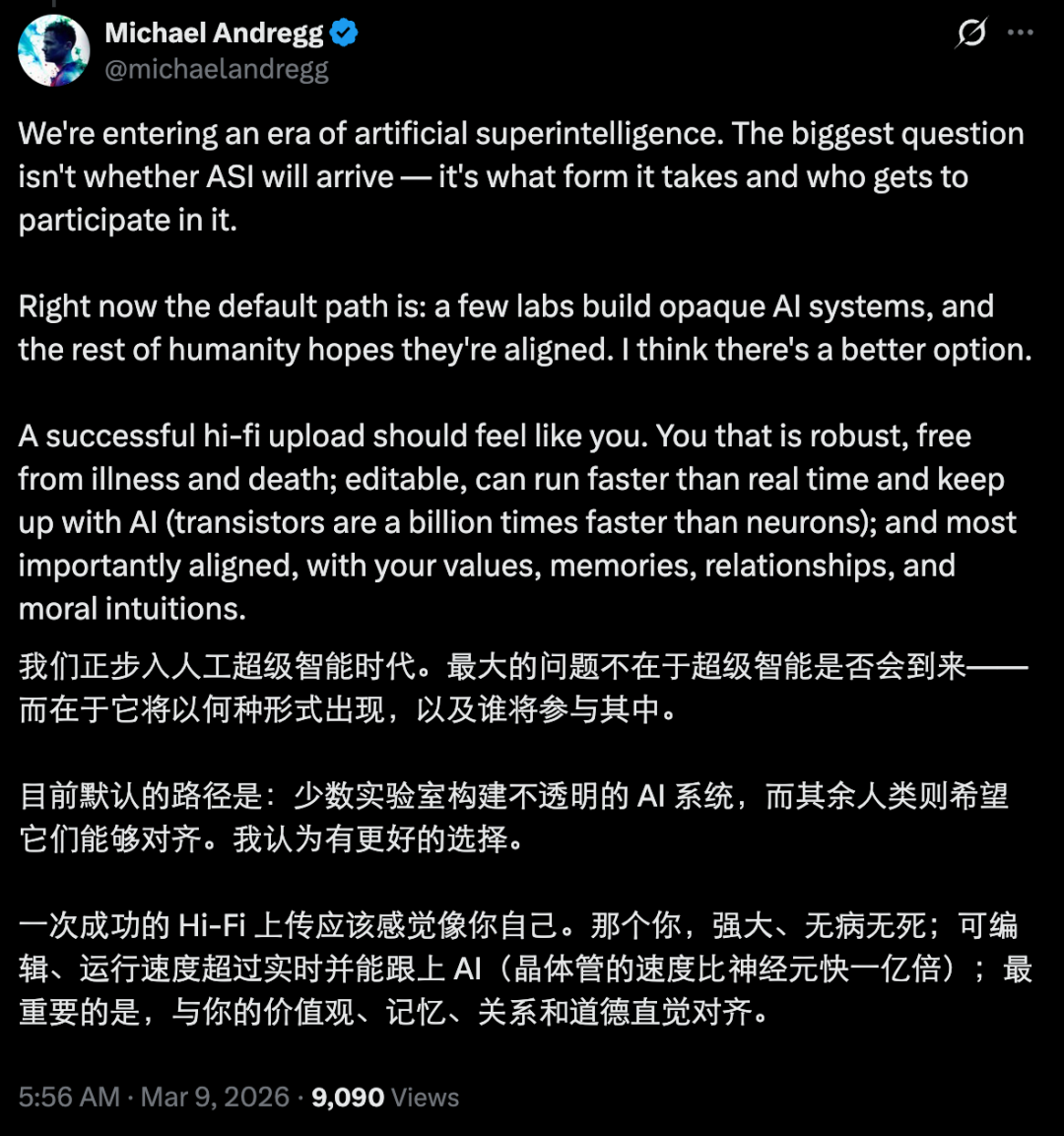 2024 年他创立 Eon Systems,试图通过「具身化全脑仿真」实现 AGI。其核心想法是:与其造一个不知道对齐谁的外来超级 AI,不如直接把人类自己变成超级智能 —— 既解决控制权问题,又让普通人也能参与 ASI 时代,而不是被甩在后面。他在个人介绍里写到,「我正在努力使人类模拟(即意识上传)成为人类在下一个十年内的一个实际选择,并且我认为这是通往超级智能的一条更安全的道路」。
