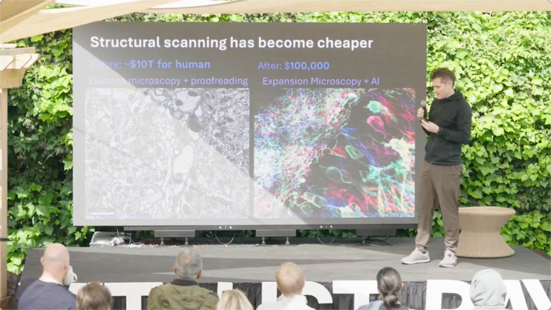 他们认为一个突破是 expansion microscopy(膨胀显微技术)。这种技术会把脑组织用聚合物「撑大」,体积放大几十倍,然后用光学显微镜扫描。好处是扫描成本更低、自动识别更容易、人工校对需求减少。他们估算,如果技术成熟,扫描一个人脑的成本可能降到 10 万美元级别。