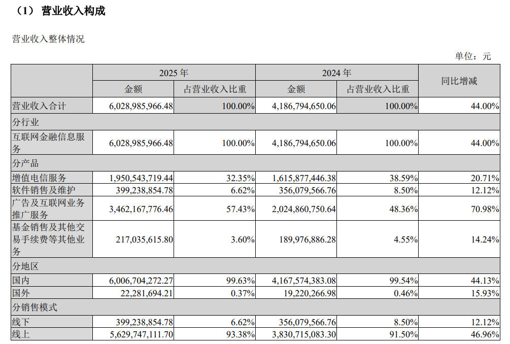 来源:公司公告,下同年报披露,报告期内,同花顺收入主要来源于增值电信服务、软件销售及技术维护服务、广告及互联网推广服务以及基金代销及其他交易服务。