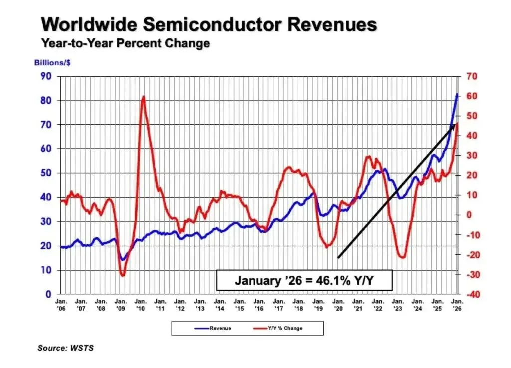 美国半导体行业协会发布数据显示,今年 1 月全球半导体销售额达 825 亿美元,较去年 12 月的 796 亿美元环比增长 3.7%,较 2025 年 1 月的 565 亿美元同比大幅增长 46.1%。