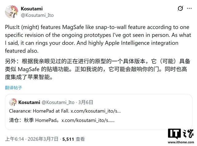 3 月 10 日消息,彭博社的马克 · 古尔曼(Mark Gurman)今天(3 月 10 日)发布博文,爆料称苹果公司计划于 2026 年 9 月随 iOS 27 系统,同步推出其首款智能家居显示器(可能叫 HomePad 或者 HomeHub)。